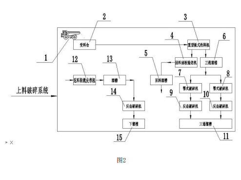 现有的石料生产上料土壤破碎系统一般采用大块石料经料仓由振动给料机送进鄂式 破碎机进行一级粗碎,一级粗碎后的石料由皮带输送机送到反击式破碎机进行进二级细 碎;经过反击式破碎机细碎后的石料由皮带输送机送进振动筛进行筛分,筛分出几种不同 粒径规格的石子,满足粒度要求的石子由成品皮带输送机送往成品料堆;不满足粒粒径要 求的石子由皮带输送机返料送到反击式破碎机进行再次破碎,形成闭路多次循环。现有技 术采用振动给料机作为石料生产系统的原料输送,因振动给料机给料能力有限,单台破碎 机处理能力有限,需要设计多条生产线来满足产量。造成占地面积较大,且大多为露天生 产,不符合环保要求。现有技术使用的反击式破碎机是二级破碎的设备,同时又承担经过筛 分系统分级后不满足粒径要求的石子返料的破碎,因通过鄂式破碎机进行粗碎后的石料粒 度组成和经过反击式破碎机细碎后的再经过筛分系统分级后不满足粒粒径要求的返料的 石料粒度组成不一样,通过一级鄂式破碎机破碎过的石料粒径通常在150~300毫米,通过 二级反击式破碎机破碎整形后的石料粒径通常在50~150毫米;且采用技术参数相同的反 击式破碎机不能有效发挥设备性能,同时影响生产线的生产能力。