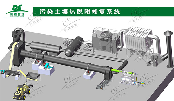 热脱附修复是通过直接或间接加热方式,将土壤中污染组分从固相或液相进入气相的修复过程。主要用于处理含挥发性及半挥发性有机污染物土壤(如石油烃、农药、多氯联苯污染)、汞污染土壤,还用于污染程度高的重金属污染土壤固化修复。热脱附单元的热源来自燃烧装置,采用顺流式加热方式。因此需要烘干的物料从进料箱、进料溜进入筒体,随即被螺旋抄板推向后端。由于烘干机倾斜放置,物料一方面在重力和回转作用下流向后端,另一方面物料被抄板反复抄起,带至上端再不断地扬撒下来,使物料在筒内形成均匀的幕帘,充分与筒内的热气流进行热交换,由于物料反复扬撒,所含的水分逐渐被烘干,从而达到烘干的目的。